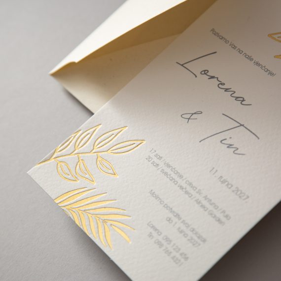Pozivnica se tiska na teksturiranom akvarel papiru debljine 0,5 mm. Tekst je tiskan digitalnim tiskom, a tipski grafički element kliše zlatotiskom. Uz pozivnice isporučuju se kuverte prema izboru. Sve dostupne kuverte možete vidjeti na nature-kuverte.com Kuverte su uključene u cijenu pozivnica. Izrada jedne grafičke pripreme je u cijeni pozivnica kao i jedan dodatni primjer s korekcijama prema potrebi.