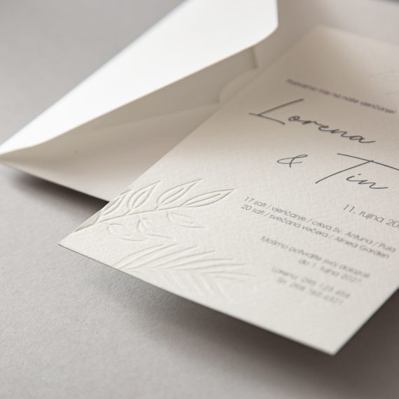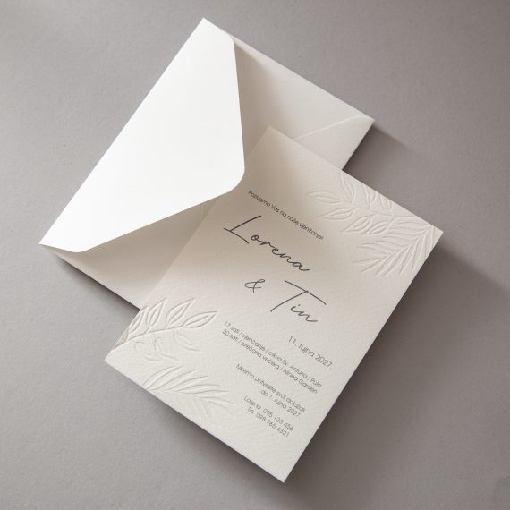Pozivnica se tiska na teksturiranom akvarel papiru debljine 0,5 mm. Tekst je tiskan digitalnim tiskom, a tipski grafički element slijepim tiskom. Uz pozivnice isporučuju se kuverte prema izboru. Sve dostupne kuverte možete vidjeti na nature-kuverte.com Kuverte su uključene u cijenu pozivnica. Izrada jedne grafičke pripreme je u cijeni pozivnica kao i jedan dodatni primjer s korekcijama prema potrebi.