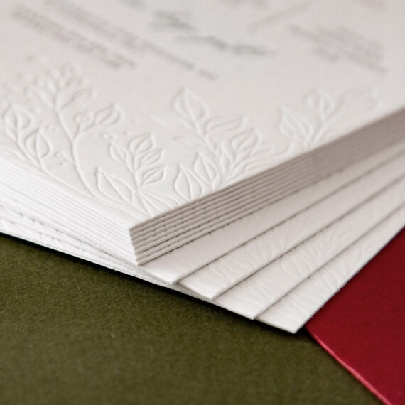 Za soft-letterpress odabrali smo papir “Soft-Press 450” . Njegova debljina i struktura omogućuju dubok, čist otisak bez gubitka forme, dok topla bijela boja naglašava profinjenost i mekoću reljefa.