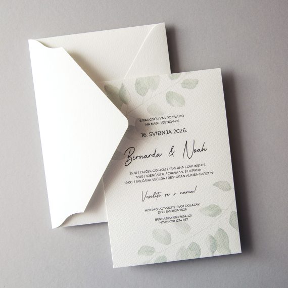 Pozivnica se tiska color digitalnim tiskom na teksturiranom akvarel papiru debljine 0,5 mm. Uz pozivnice isporučuju se kuverte prema izboru ili kuverte koje su prikazane uz pozivnice. Sve dostupne kuverte možete vidjeti na nature-kuverte.com Kuverte su uključene u cijenu pozivnica. Izrada jedne grafičke pripreme je u cijeni pozivnica kao i jedan dodatni primjer s korekcijama prema potrebi.
