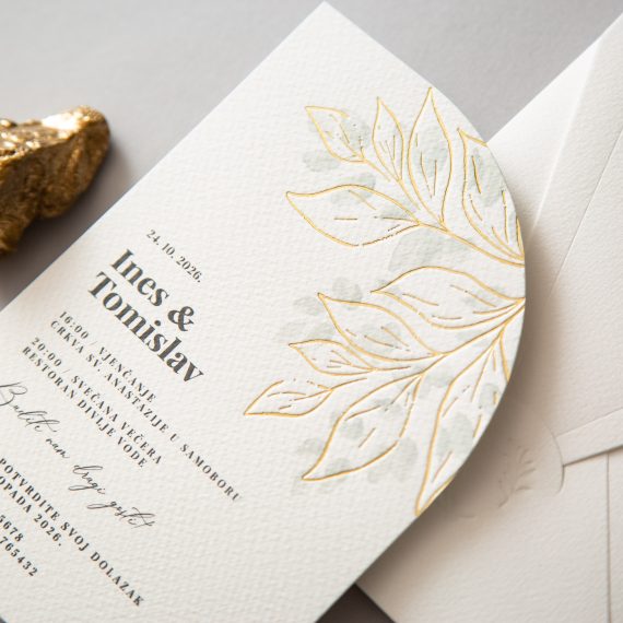 Pozivnica se tiska na teksturiranom akvarel papiru debljine 0,5 mm rezanom u polukrug. Tekst je tiskan digitalnim tiskom, a grafički elementi kliše zlatotiskom. Uz pozivnice isporučuju se kuverte prema izboru ili kuverte koje su prikazane uz pozivnice. Sve dostupne kuverte možete vidjeti na nature-kuverte.com Kuverte su uključene u cijenu pozivnica. Izrada jedne grafičke pripreme je u cijeni pozivnica kao i jedan dodatni primjer s korekcijama prema potrebi.