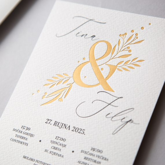 Pozivnica se tiska na teksturiranom akvarel papiru debljine 0,5 mm. Tekst je tiskan digitalnim tiskom, a tipski grafički element kliše zlatotiskom. Uz pozivnice isporučuju se kuverte prema izboru. Sve dostupne kuverte možete vidjeti na nature-kuverte.com Kuverte su uključene u cijenu pozivnica. Izrada jedne grafičke pripreme je u cijeni pozivnica kao i jedan dodatni primjer s korekcijama prema potrebi.